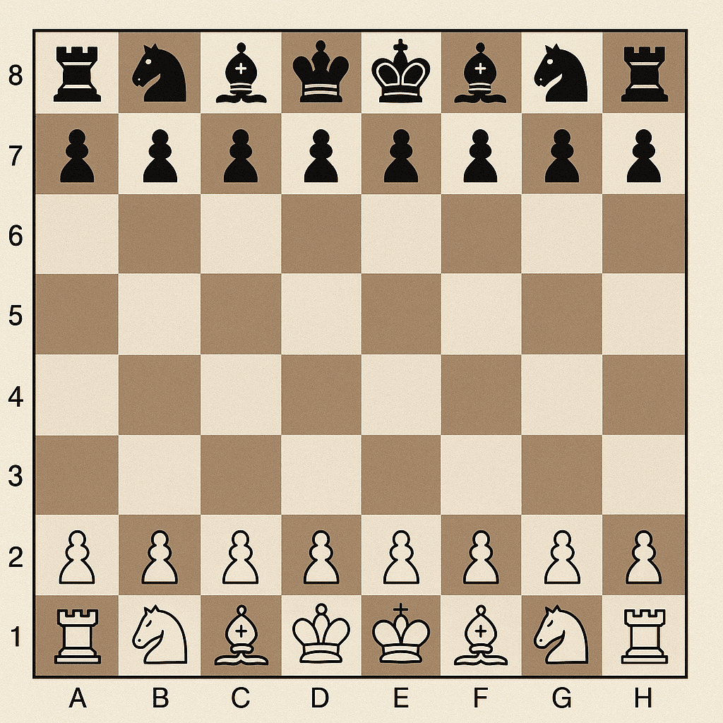 Au départ, les Blancs sont toujours sur les rangées « 1 » et « 2 » et les Noirs sur les rangées « 8 » et « 7 ». Par convention, chaque joueur doit avoir à sa droite une case blanche (h1 pour les Blancs et a8 pour les Noirs).