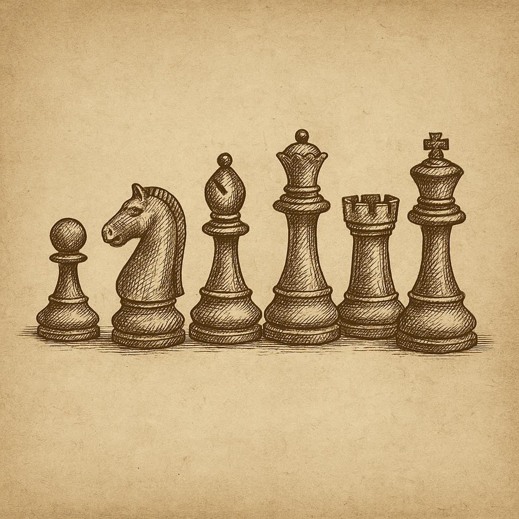Chaque joueur possède initialement un roi, une dame, deux fous, deux cavaliers, deux tours et huit pions.