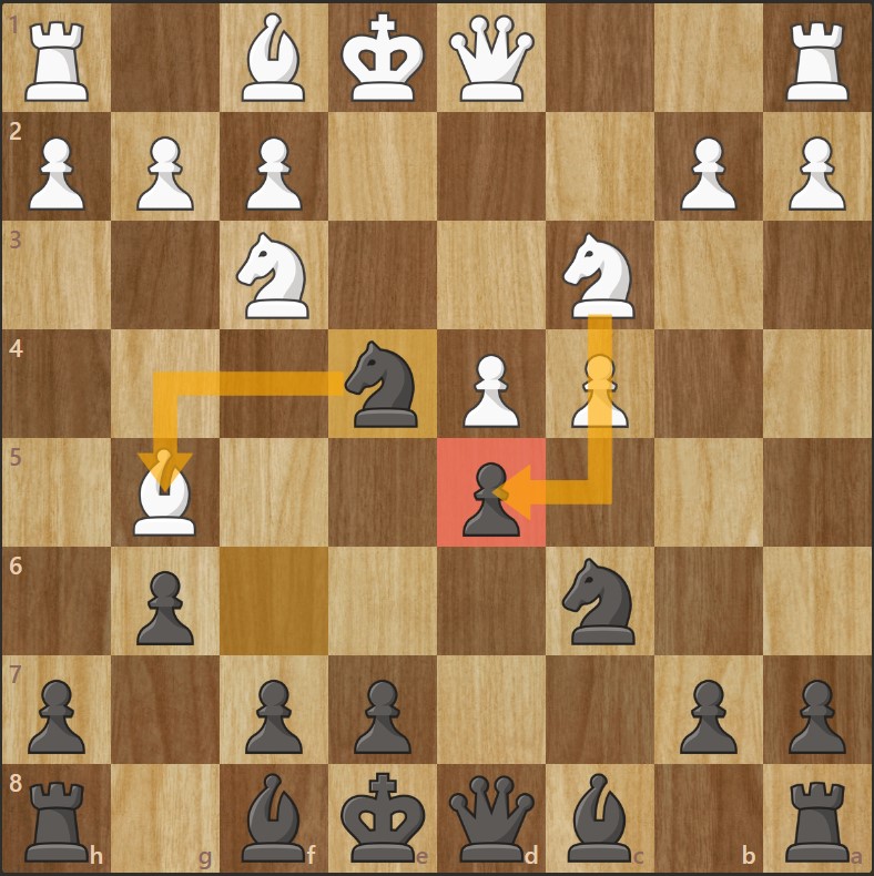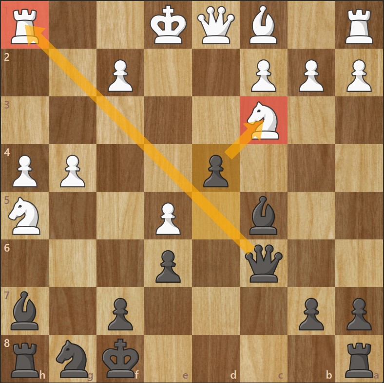 Puis les Noirs poussent d4 qui attaque le cavalier avec le pion et la tour à la découverte.