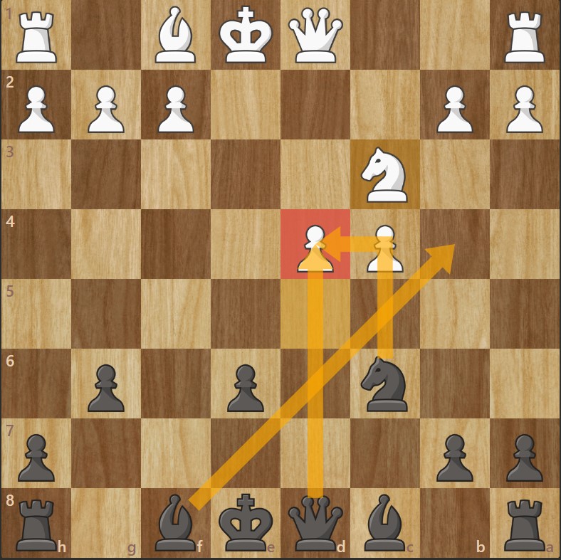 - Les Blancs développent leur fou en menaçant le cavalier f6. Le risque pour les Noirs est également de se retrouver avec des pions doublés. (souvent mauvais)