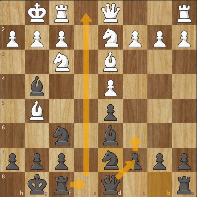 - Les Noirs placent leur tour sur e8. Cela permet d’occuper la colonne ouverte et de ménager une case de repli pour le fou en cas de Cb5 des Blancs. (cf. schéma)