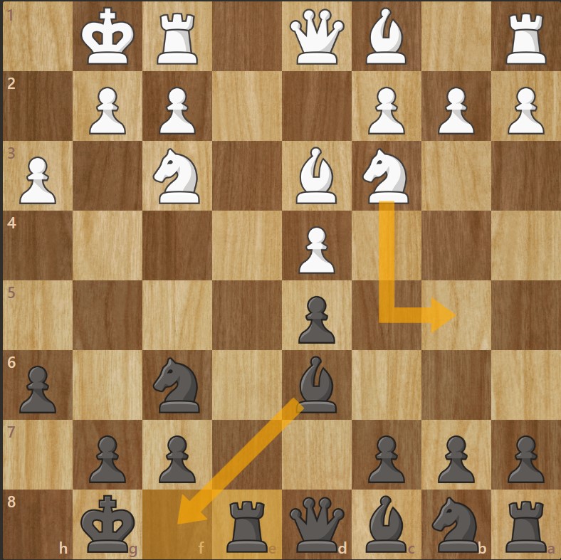 - Les Blancs activent leur cavalier vers le centre, menacent Cb5. (cf. schéma)