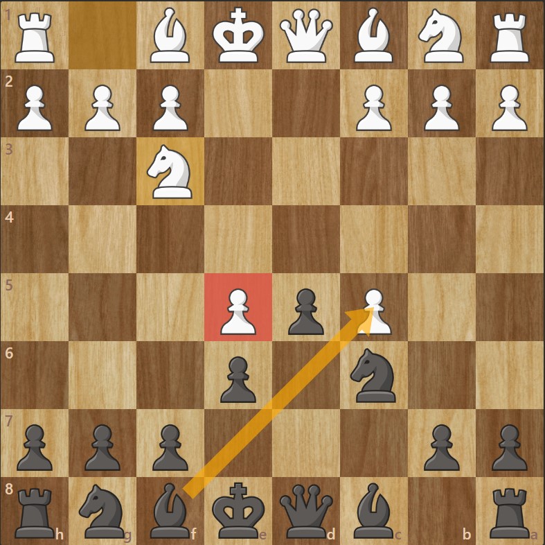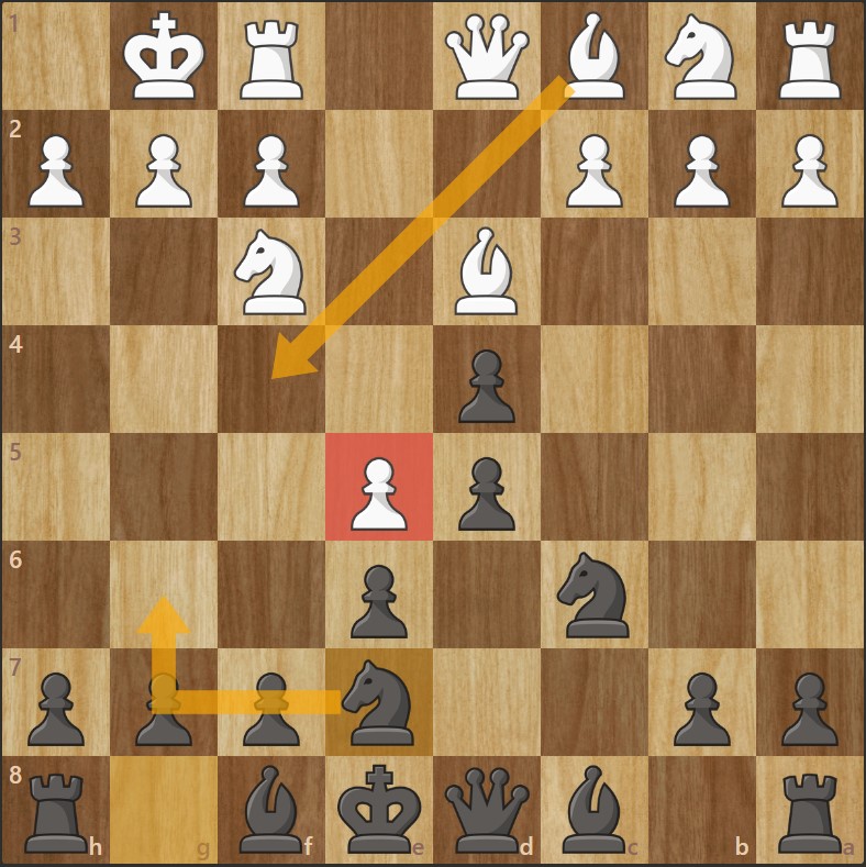 - Les Noirs développent le fou en b4 : après l’échange du fou contre le cavalier. Le pion b5 pourra être récupéré par les Noirs.
