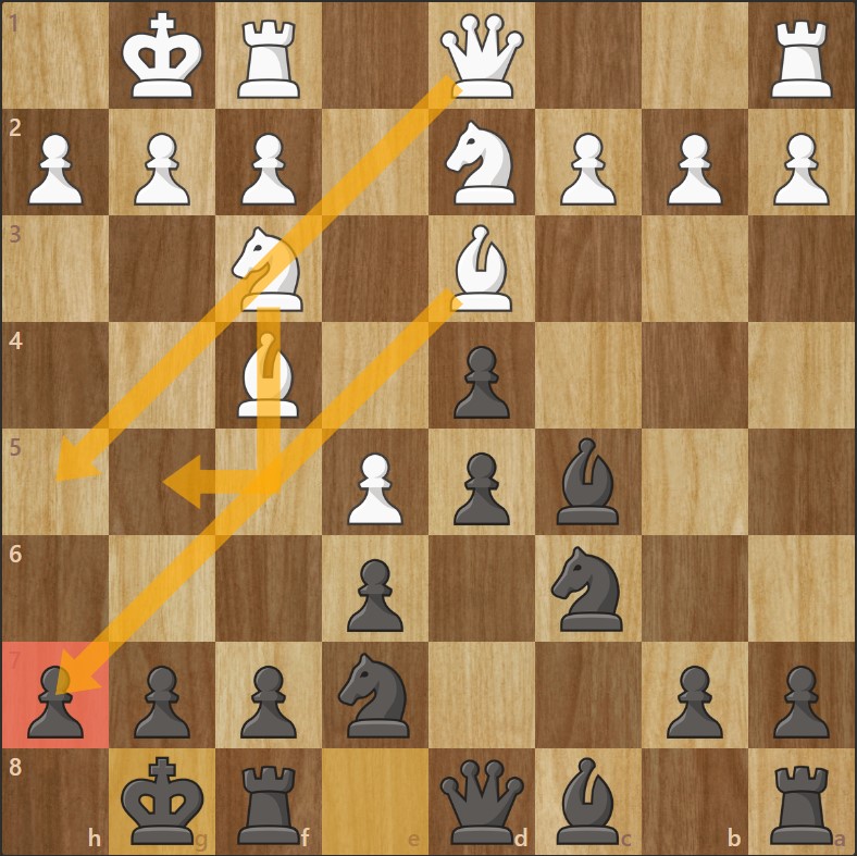- La dame se joint à l’attaque, visant h7 et f7.