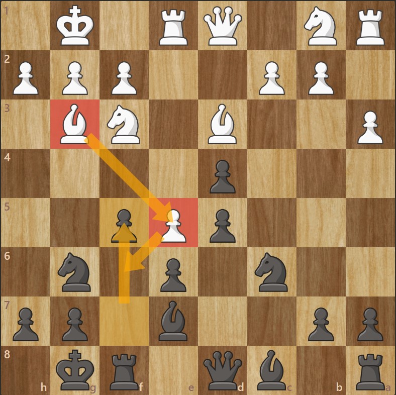 - Les Noirs échangent au centre ; le fou blanc protège e4/e5 et vise h7.