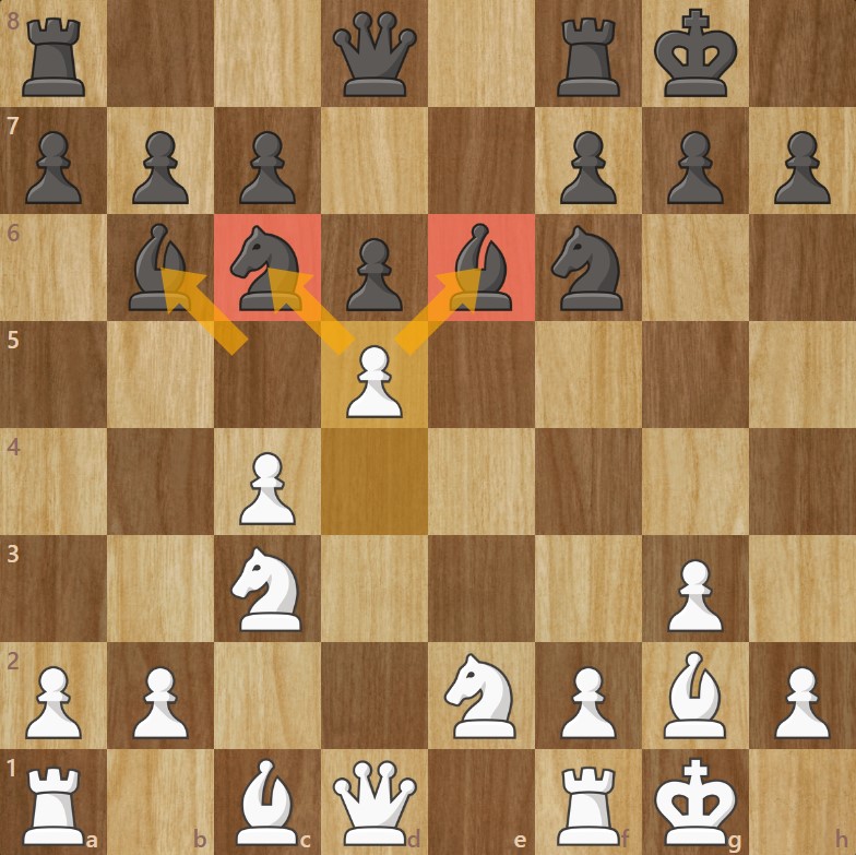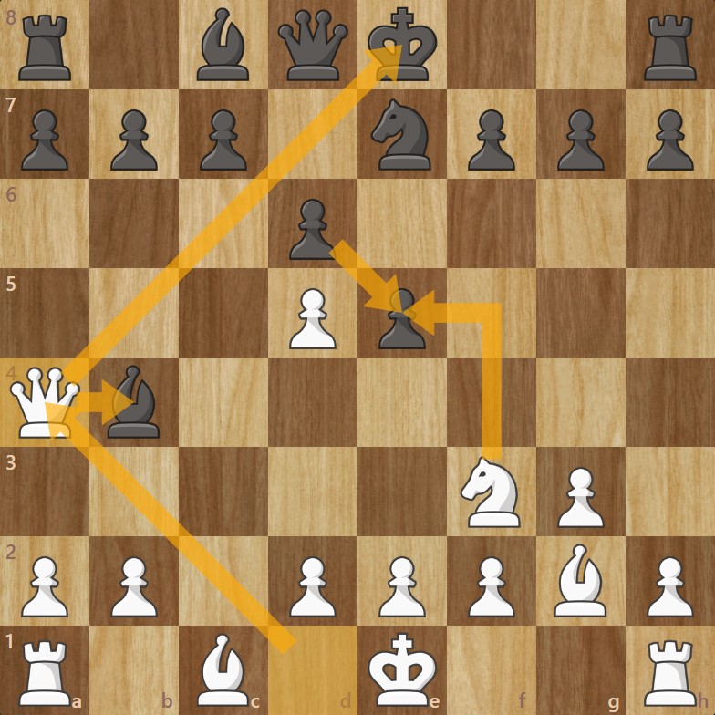 Les Blancs auraient dans cette position la possibilité de récupérer le pion e5, en attaquant à la découvert le cavalier en d5 du même coup.