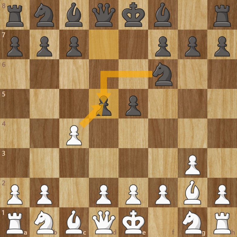 - Les Blancs reprennent du pion, attaquant le cavalier en c6.