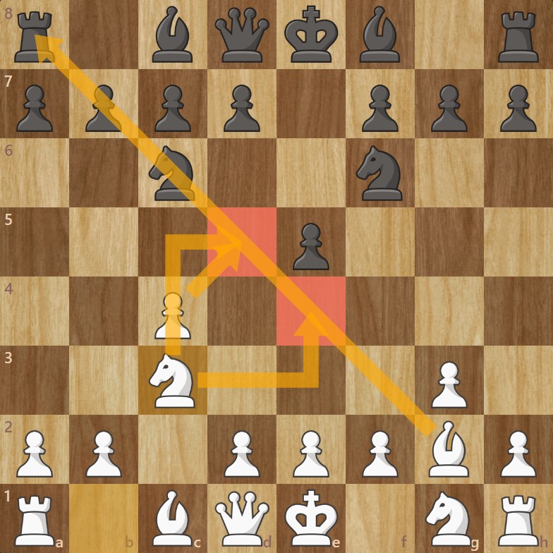 On remarque une très bonne synergie entre les pièces blanches qui ont le contrôle de d5 et e4, mais aussi plus largement de toute la diagonale h1-a8.