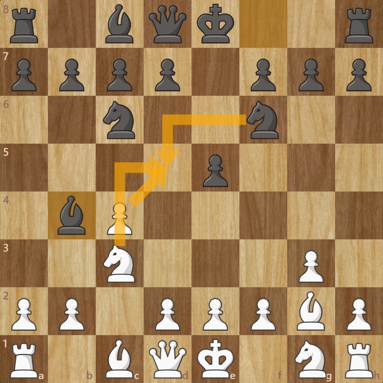Dans cette situation, les Noirs doivent absolument éviter de prendre le cavalier en c3. Il en résulterait une position plus difficile à jouer pour un débutant / intermédiaire, où les Blancs peuvent assez facilement prendre le contrôle du centre. (cf. schéma suivant)