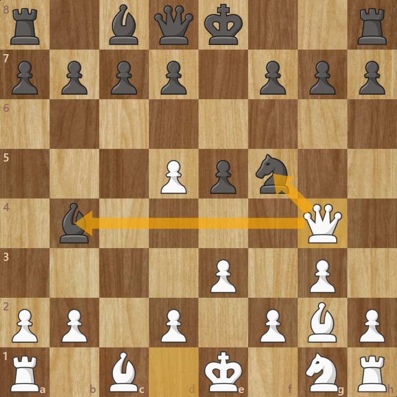 - Une fois de plus, double attaque de la dame sur le fou et le cavalier. Les deux pièces ne pourront pas survivre.