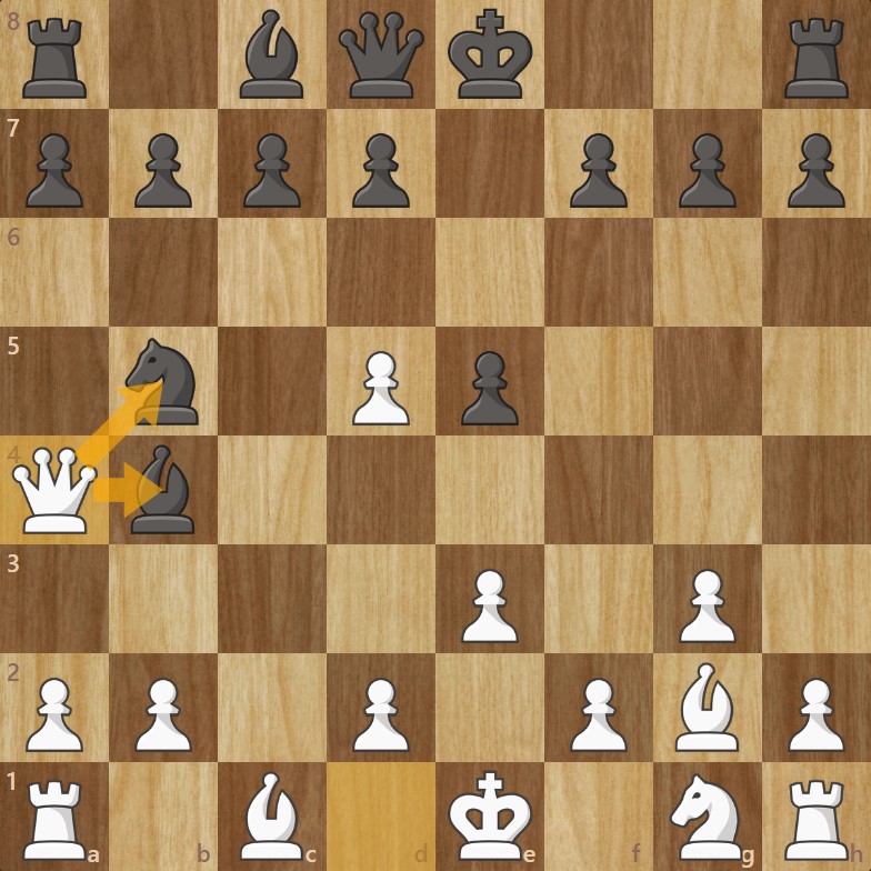 Dans cette variante, les Noirs prennent le parti de manger le pion d5 non défendu, plutôt que de protéger leur pion e5.