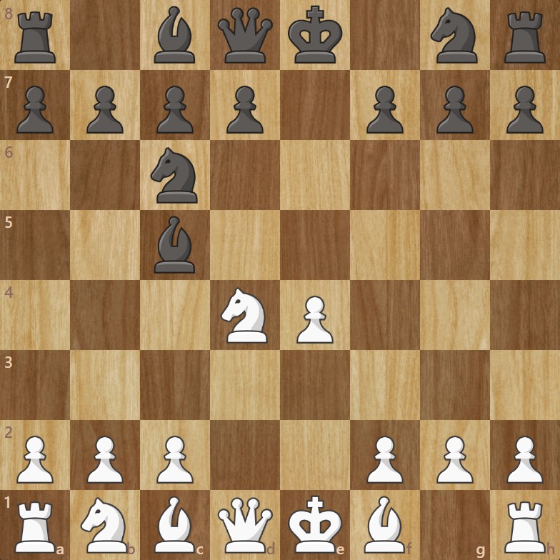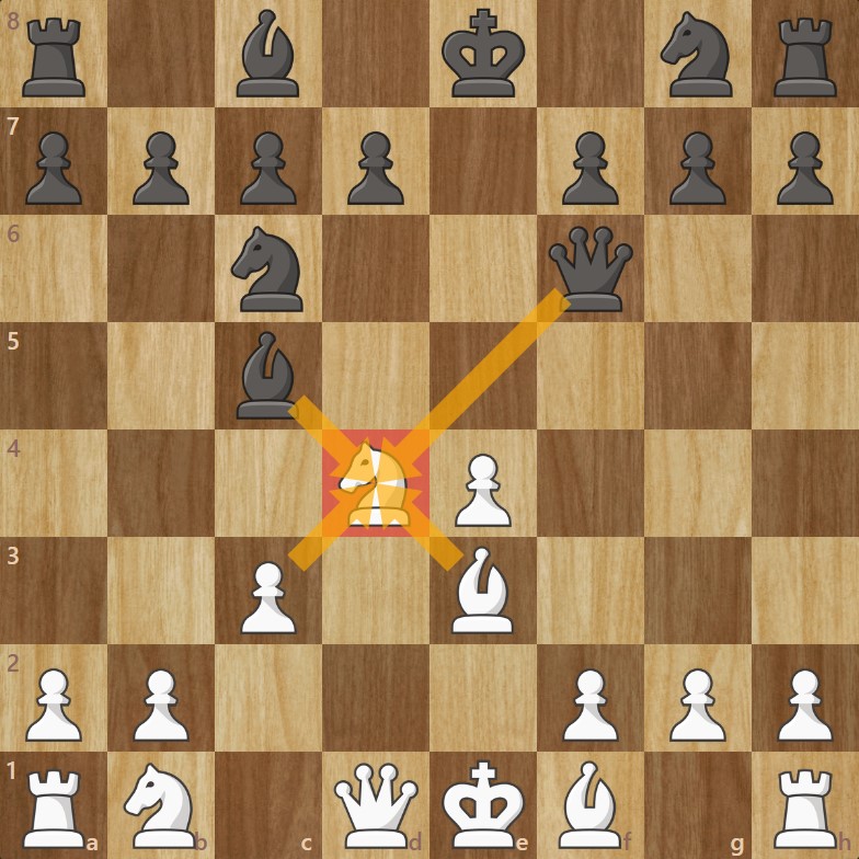 - Les Blancs prennent le cavalier, menaçant du même coup la dame noire. Il est important de faire ce coup en premier. En effet, si les Blancs sortent le fou en d3 en 1er, le cavalier d4 n’est plus protégé par la dame.