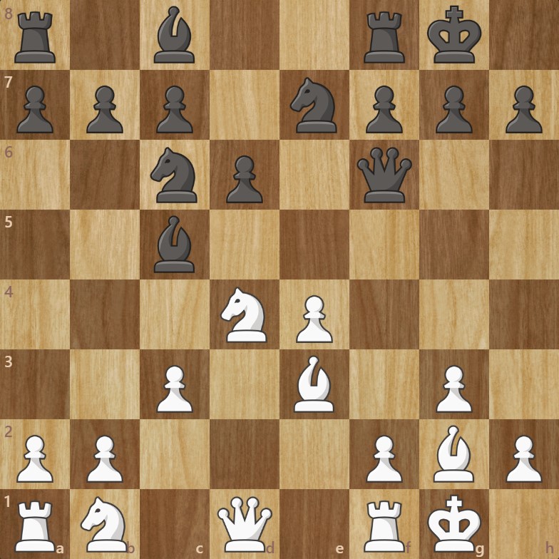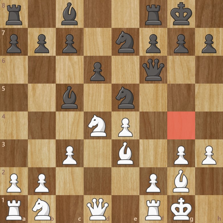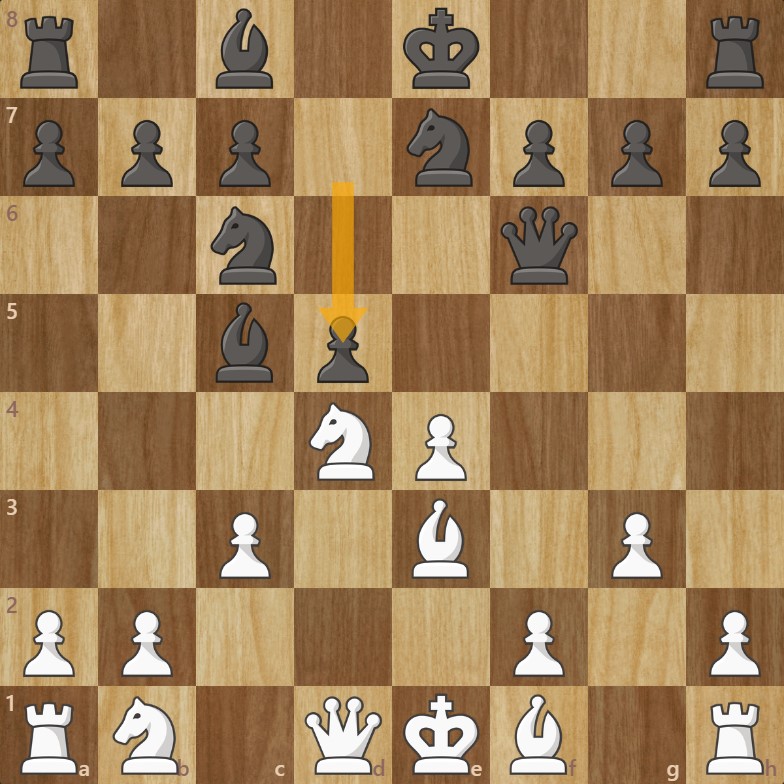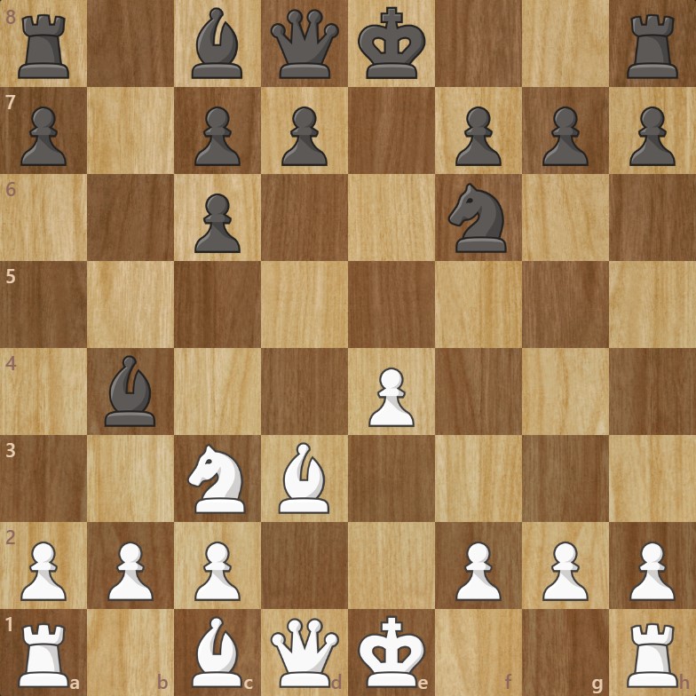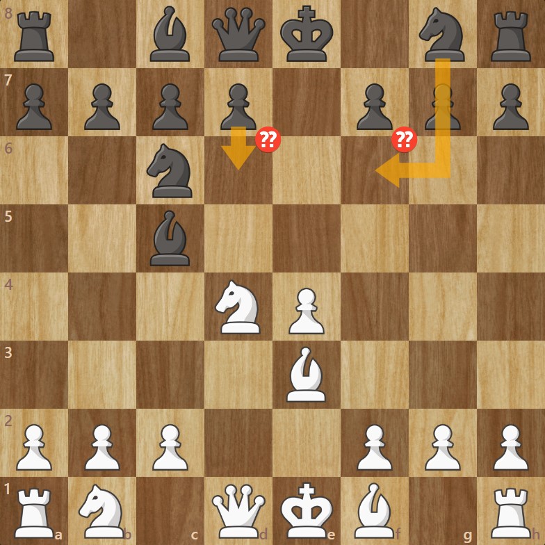 - Ce coup de développement peut sembler logique, mais n’oublions pas que le fou en c5 n’est pas protégé. L’enjeu pour les Blancs sera de jouer sur ce point faible des Noirs.