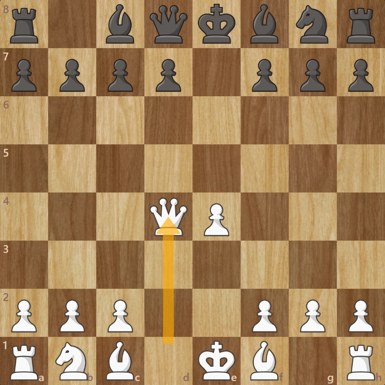 Habituellement on préfère éviter de sortir la Dame trop tôt afin d’éviter de se faire chasser par l’adversaire en même temps qu’il développe ses pièces. Sauf qu’ici, aucune pièce noire ne peut correctement (sans compromettre un développement harmonieux) attaquer la Dame blanche.