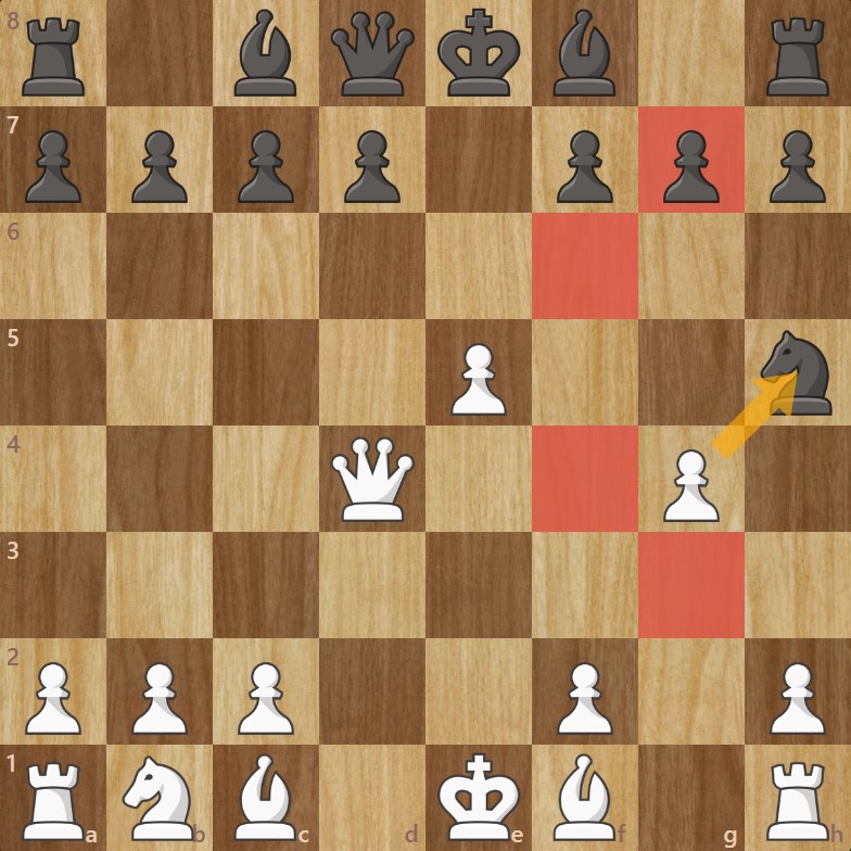Si les Blancs jouent f4, la situation est d’autant plus catastrophique qu’ils ouvrent la diagonale noire dans l’axe de leur roi, en plus de laisser l’accès à la case g4.