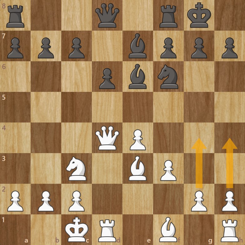 Dans ce genre de position, le premier à attaquer le roque adverse est bien souvent gagnant. Et on se rend compte sans problème sur le schéma que les Blancs auront l’initiative de l’attaque :