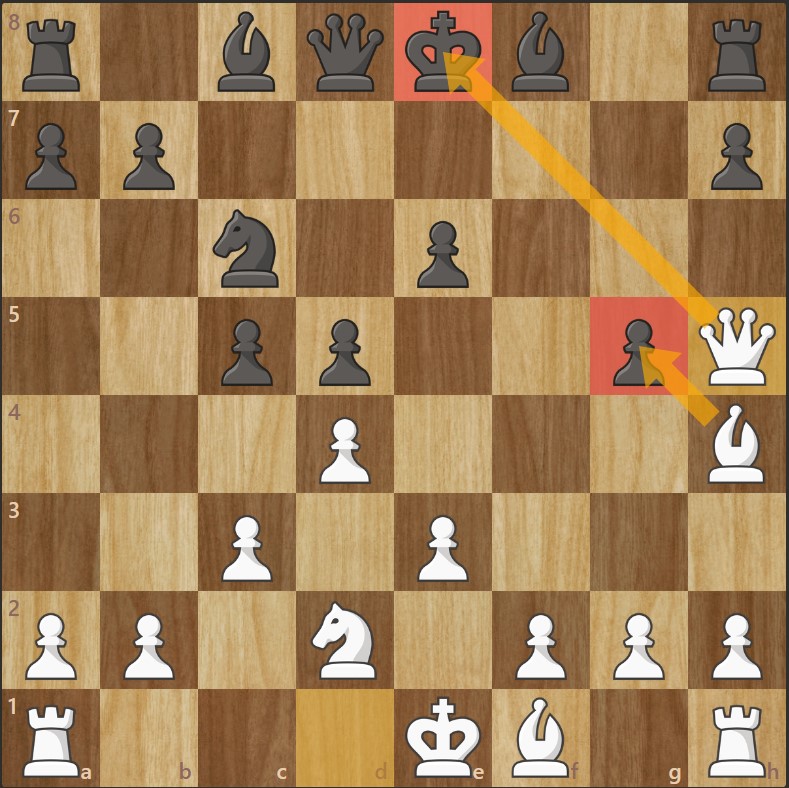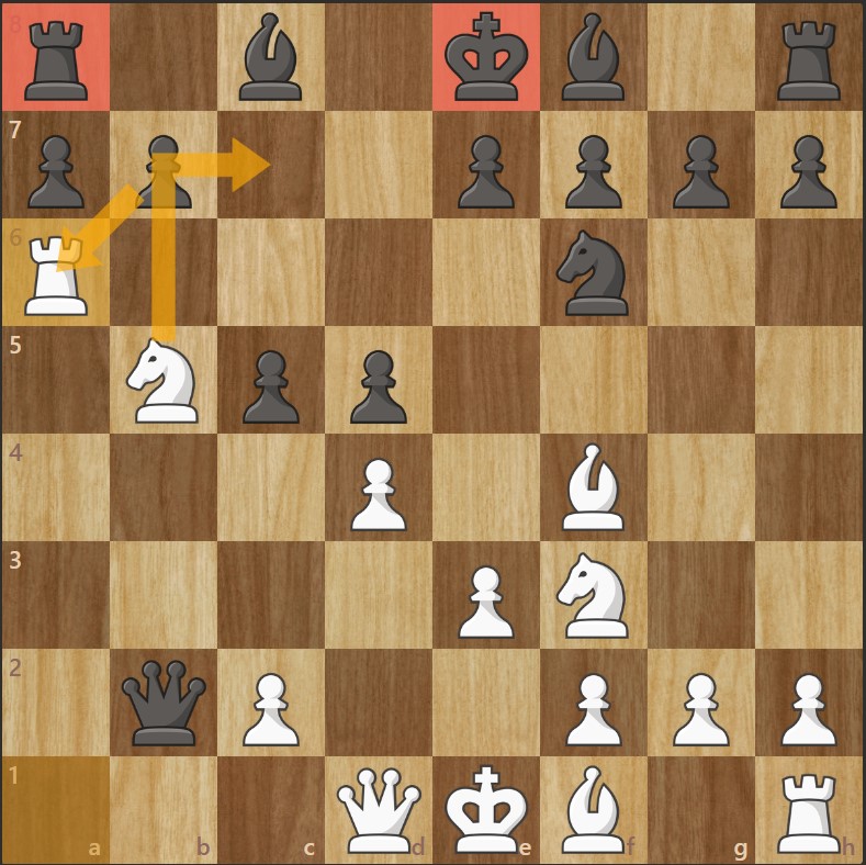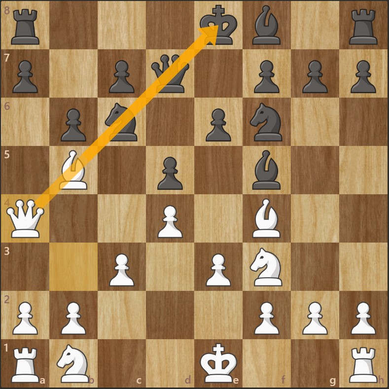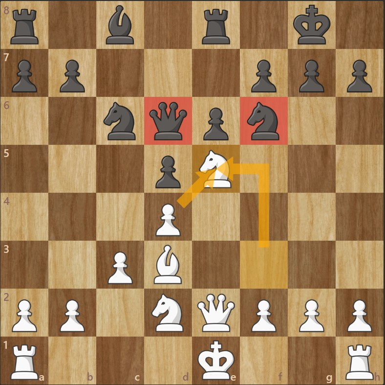 Le développement suit son cours, mais si les Noirs échangent le cavalier en e5, les Blancs gagneront à minima du matériel, et potentiellement la partie avec un joli MAT expliqué juste après !
