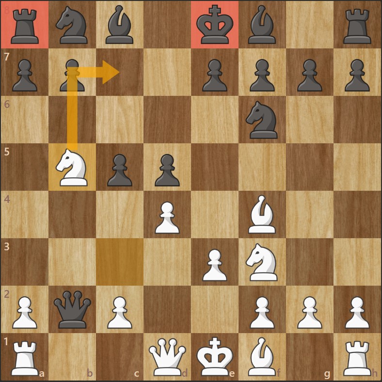 Et la fourchette des Blancs en c7 est inévitable. Le roi est déroqué et un avantage matériel est pris !