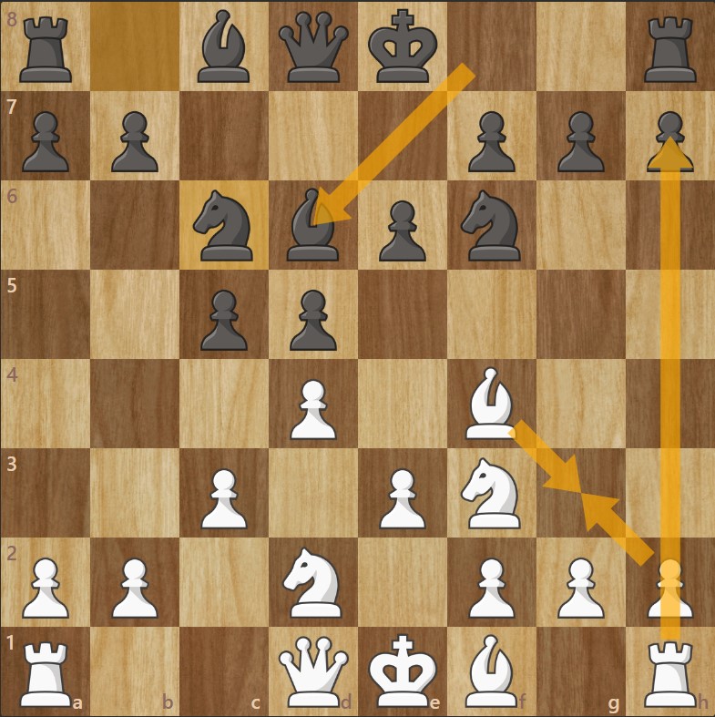 Li’dée sera ici de se replier en g3 (Fg3) comme sur le schéma ci-dessus. Si les Noirs prennent le fou, notre colonne h sera grande ouverte face au potentiel futur petit-roque des Noirs.